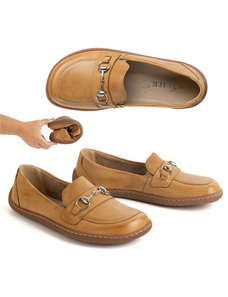 Brązowe mokasyny barefoot skórzane damskie szerokie na elastycznej płaskiej podeszwie złota sprzączka PRODUKT POLSKI Casu 677-8