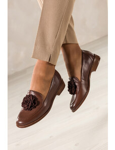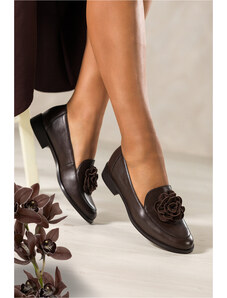 Czekoladowe mokasyny skórzane damskie półbuty płaskie z ozdobnym kwiatem na cholewce PRODUKT POLSKI Casu 8105