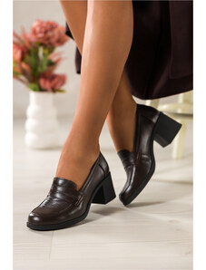 Czekoladowe mokasyny skórzane damskie na szerokim klocku ozdobny pasek PRODUKT POLSKI Casu 2762