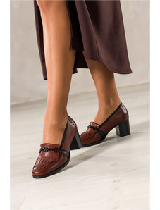 Brązowe mokasyny skórzane damskie na słupku z frędzlami i czarną sprzączką PRODUKT POLSKI Casu 6952-700-449