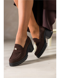 Czekoladowe mokasyny skórzane damskie na szerokim klocku bieżnikowana platforma złota ozdoba PRODUKT POLSKI Casu 79831