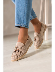 Beżowe mokasyny damskie półbuty płaskie ozdobione frędzlami kokardą i koralikami skórzana wkładka Carla QS440K
