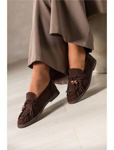 Czekoladowe mokasyny damskie półbuty płaskie ozdobione frędzlami kokardą i koralikami skórzana wkładka Carla QS440K