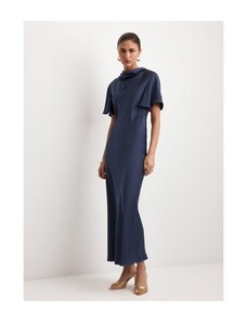 MANGO - Satynowa sukienka z drapowanym dekoltem ciemnoniebieski - S - Kobieta