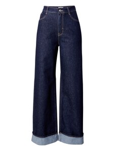 Design: Rozporek na zamek błyskawiczny; Rodzaj zamknięcia: Zamek błyskawiczny; Materiał: Jeans; Wzór: Jednolite kolory; Dodatki: Naszywka z logo, Szlufki na pasek; Pranie: Niebieski denim/prany; Długość: Długi / Maxi; Krój: Szeroka nogawka; Wysokość talii: Wysoka talia. R-0.1. P-0.3159112856. RQ-0.75