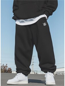 Spodnie dresowe o oversizowym kroju. Posiadają dwie kieszenie i gumę w pasie regulowaną sznurkiem. Ozdobione haftowanym logo.