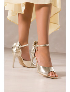 Złote sandały skórzane damskie szpilki z zakrytą piętą pasek wokół kostki ozdoba z kryształkiem kokarda PRODUKT POLSKI Casu 6196