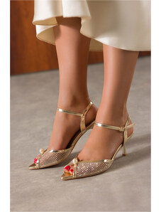 Złote sandały damskie szpilki obcas kieliszek siateczka z cyrkoniami perła Carla O6801