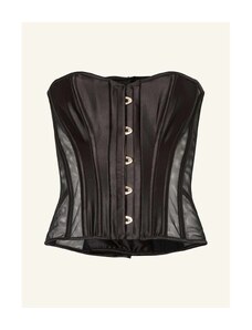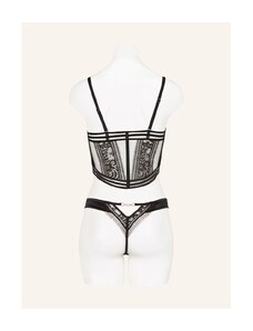 Pionowy szew dla szczególnie dobrego efektu podniesienia biustu. Zintegrowane fiszbiny. Zintegrowane fiszbiny. Regulowane cienkie ramiączka. Trzystopniowa regulacja z tyłu. Przezroczyste wykonanie z tiulu. Hafty z motywem serca